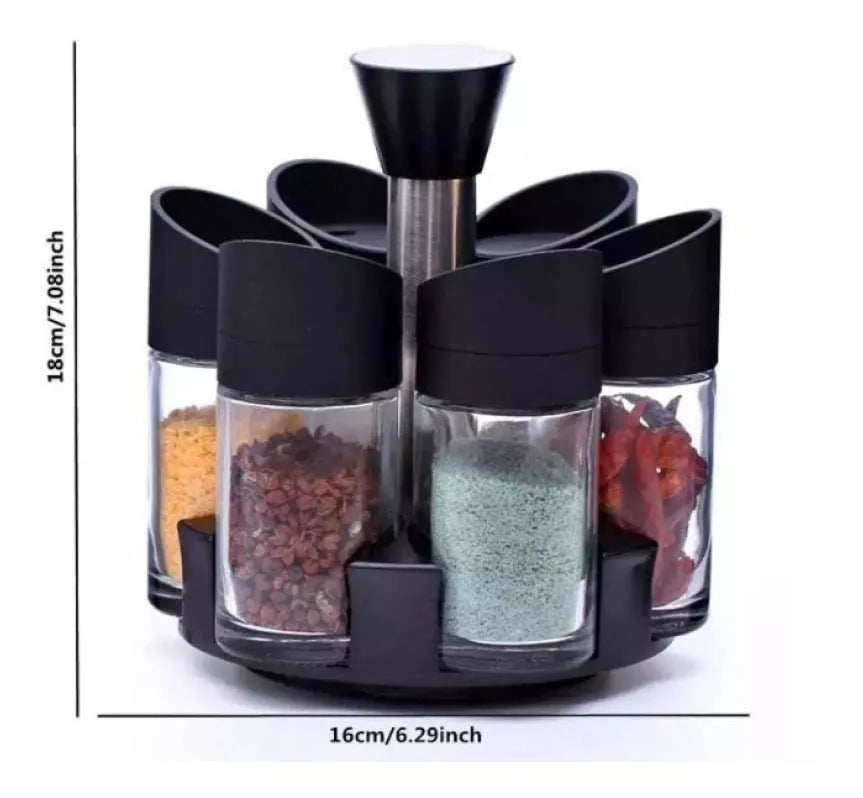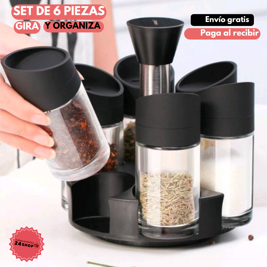 Da un giro de sabor a tus comidas con nuestro set condimentero giratorio de 6 piezas. Mantén tus especias y condimentos favoritos al alcance de tu mano con estilo y organización. Transforma tu experiencia culinaria y agrega un toque de elegancia a tu cocina. ¡Gira hacia la sazón perfecta con este set imprescindible!